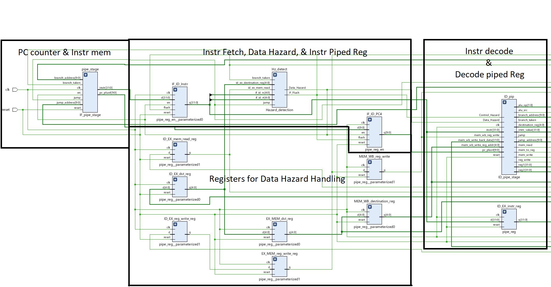ALU, Data Memory, control module, and Hazard handler. The processor uses the same logic as the single cycle processor, but provides a register in between