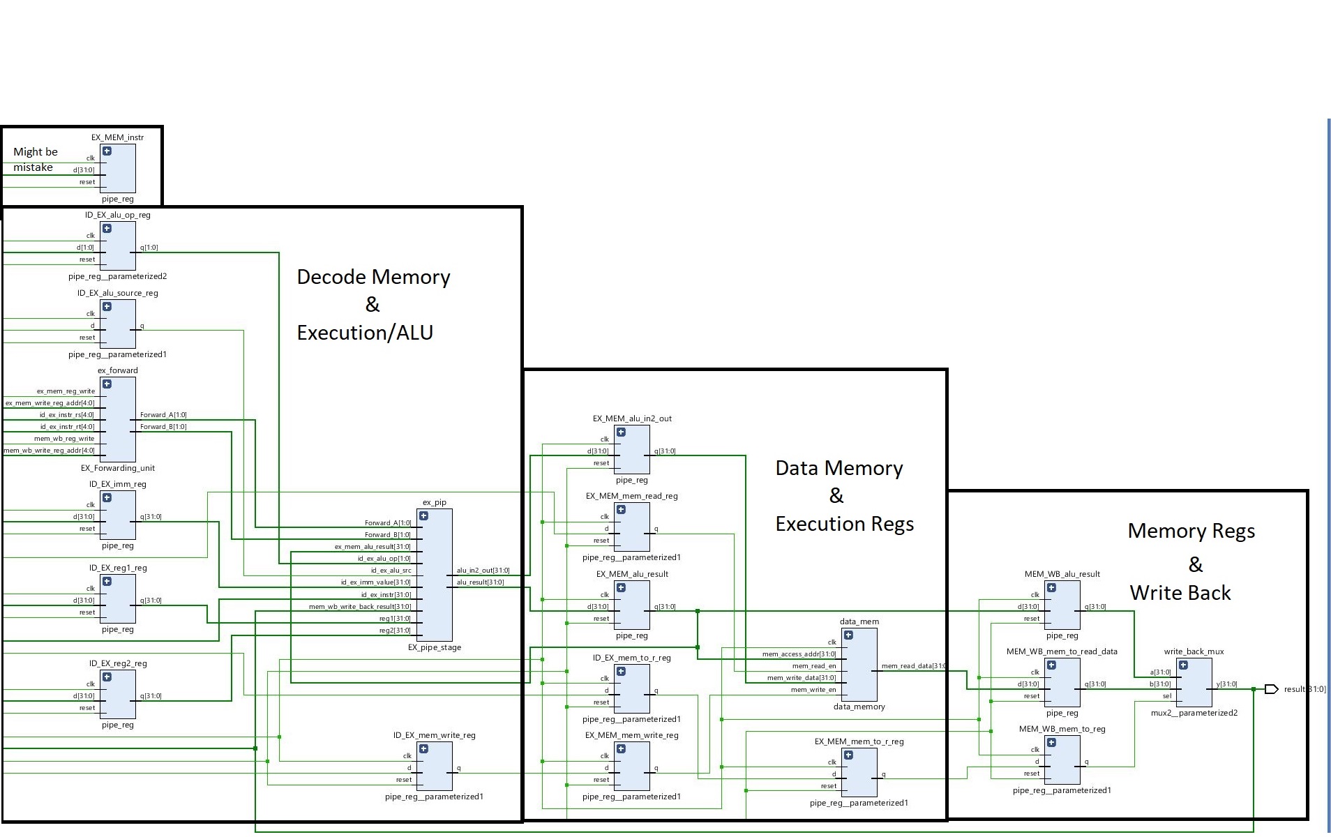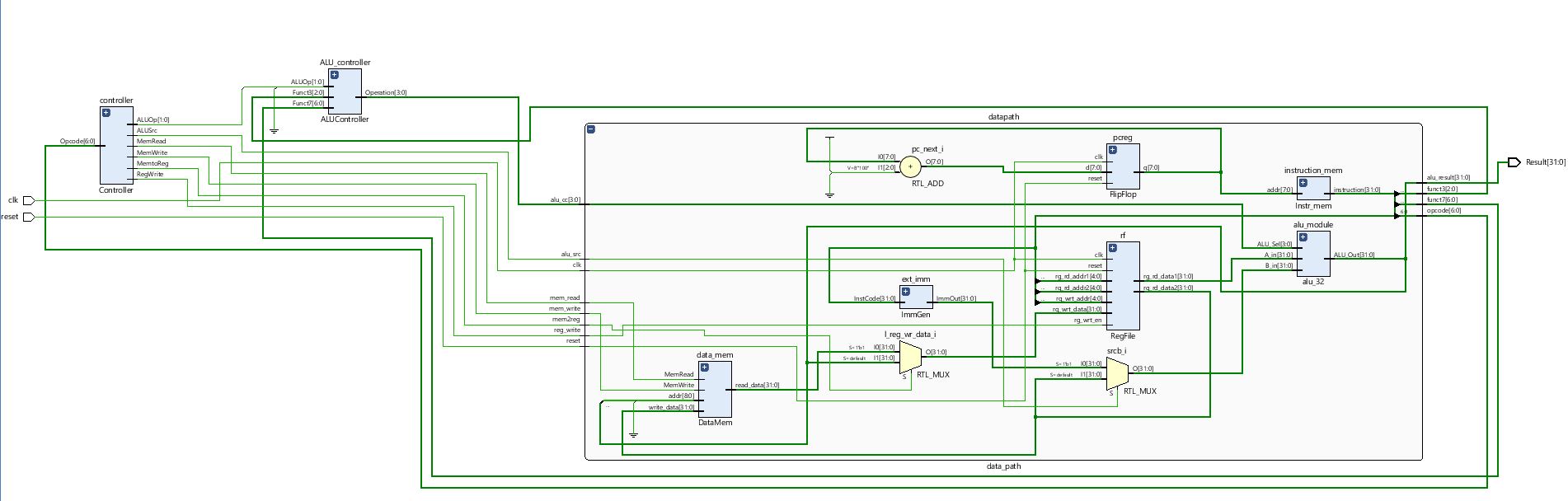 The Data memory is the final memory stored used when user Loads. The control module manages different Instruction types, I type, R type, J type.